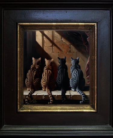 39 x 38 x 0.2 oil on canvas, layered on sealed canvas, framed in wood, click to see more info-
